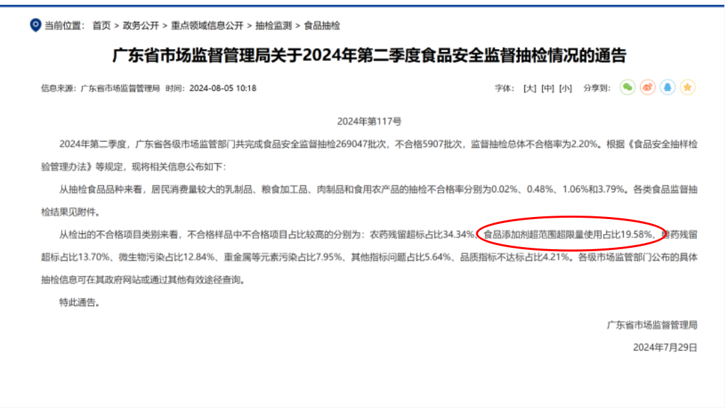 根据广东省市场监督管理局官网发布的2024年第二季度食品安全监督抽检情况的通告可知,食品添加剂超范围超限量使用的情况占不合格批次的19.58%,不合格率排名第二。