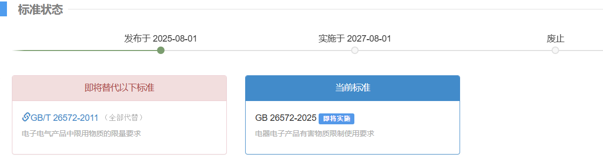 2025 年 8 月 1 日,国家市场监督管理总局(国家标准化管理委员会)发布 2025 年第 18 号标准公告,批准发布 35 项强制性国标,其中包括中国 RoHS 第一份强制性国标《电器电子产品有害物质限制使用要求》(GB 26572-2025),该标准将于 2027 年 8 月 1 日正式实施,并全面替代原有推荐性国标 GB/T 26572-2011。