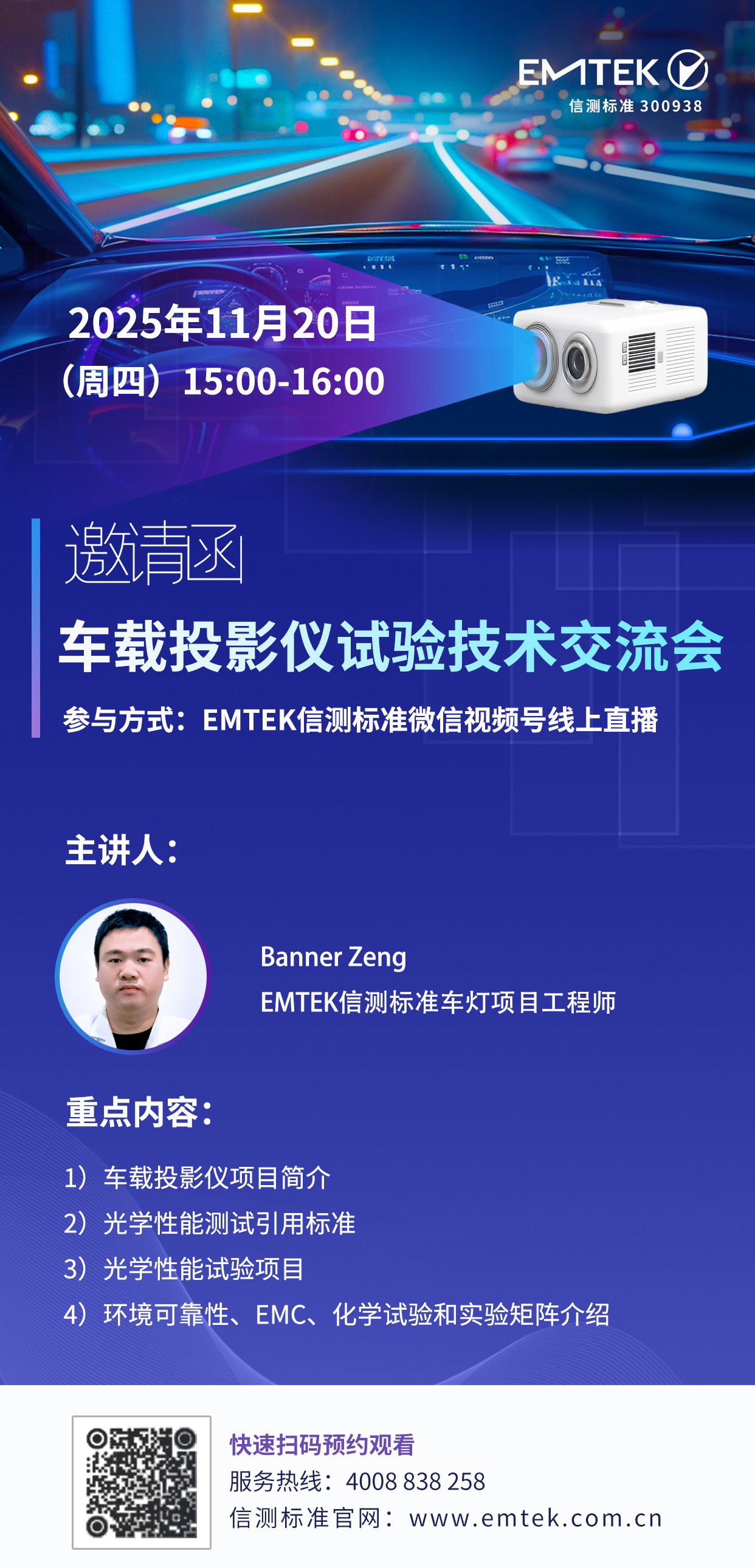 11月20日(下周四)下午15:00,标检特邀您参与“车载投影仪试验技术线上交流会”,共同就光学性能试验项目及最新的认证标准,相关试验要求与案例进行交流与探讨,赶紧预约观看吧!