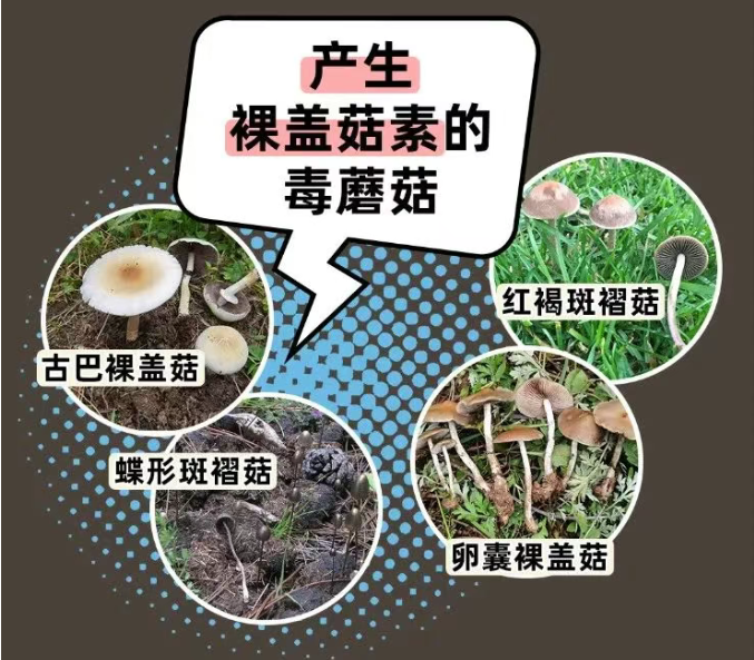 目前已知的可以产生裸盖菇素的毒蘑菇包括裸盖菇属、斑褶菇属和裸伞属,这种类型的中毒在我国蘑菇中毒事件中十分常见,成为威胁人民群众健康的重要危险因素。产裸盖菇素毒蘑菇具有致幻作用,误食后发病快,一般几十分钟内即可出现焦虑、紧张、轻微头痛、腹痛、恶心、眩晕、乏力、寒战、肌痛及嘴唇麻木等症状,随后出现幻觉。